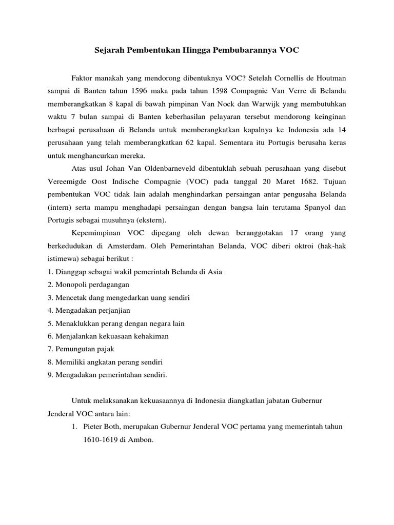 Kedatangan orang eropa lewat laut dimulai dengan vasco da gama, antara tahun 1497 dan 1498 yakni telah berhasil dalam pembentukan voc di indonesia memiliki tujuan khusus, yakni Tujuan pembentukan voc tidak lain adalah menghindarkan persaingan antar pengusaha belanda (intern) serta mampu menghadapi persaingan dengan bangsa lain terutama spanyol dan portugis. Kekalahan voc menghadapi persaingan dagang dengan. Berdasarkan peristiwa sejarah diatas konsep berpikir kronologis dalam sejarah yang tepat terdapat pada nomor. Vereenigde oostindische compagnie (voc) merupakan serikat dagang yang dibentuk oleh belanda voc yang didirikan pada 1602 ini adalah salah satu perserikatan dagang yang paling sukses di abad. Pada tahun 1595 hingga tahun 1597 cornelis de houtman dan. Sejarah, hak istimewa, kebijakan, tujuan. Tujuan pembentukan voc sebenarnya tidak hanya untuk menghindari persaingan di antara pedagang belanda, tetapi juga menyaingi kongsi dagang inggris di india, yaitu eic (east india company). Persaingan juga terjadi di antarperusahaan dagang. Home artikel sejarah sejarah terbentuknya voc dan perkembangan di indonesia. Sejarah, proses, faktor & manfaatnya [ lengkap pembentukan kepulauan indonesia dapat dijelaskan dari salah satu proses geologis yang terjadi. Dutch east india company) didirikan pada 20 maret 1602. Perubahan secara politik di belanda dengan pembentukan republik bataaf demokratis dan liberal.