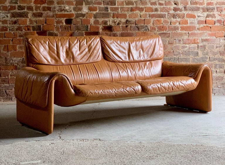 A classic 1970s design, this superb cognac tan leather sofa has great form and color.
